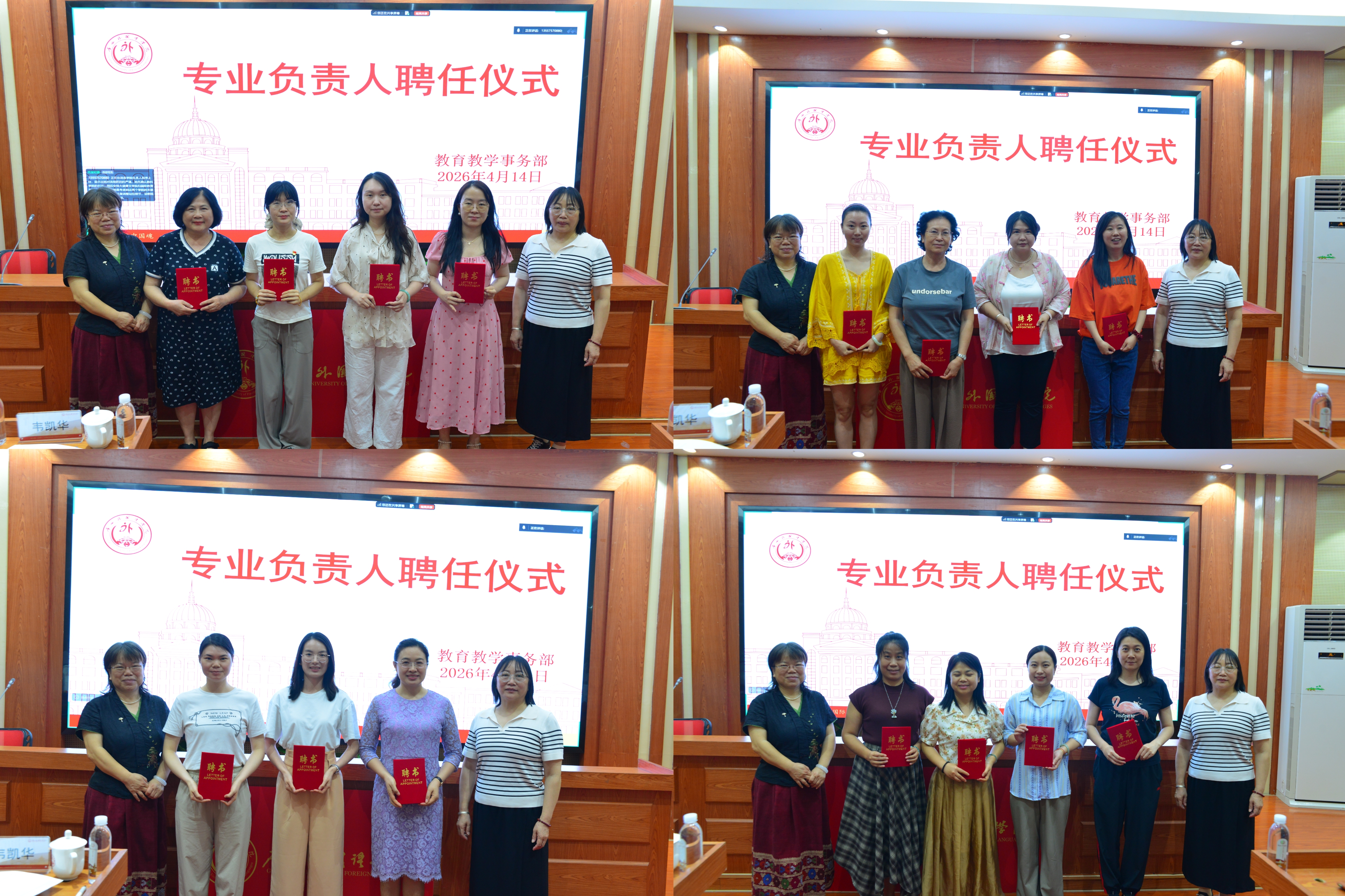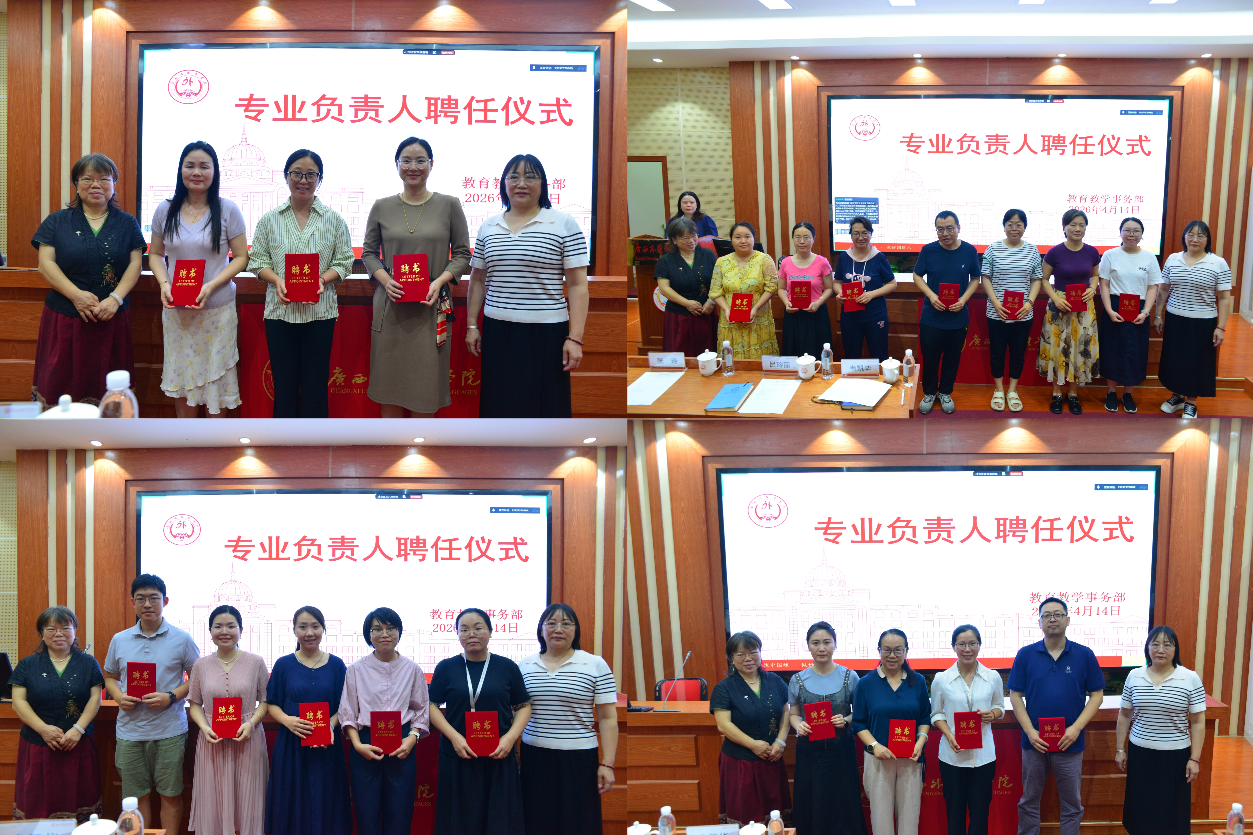 随后,人力资源事务部部长韦凯华宣读了受聘专业负责人名单。会议举行了隆重的专业负责人聘任仪式,吕玲丽执行校长、韦凯华部长共同为46个本科专业的专业负责人颁发聘书。